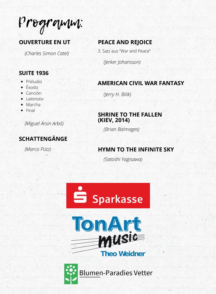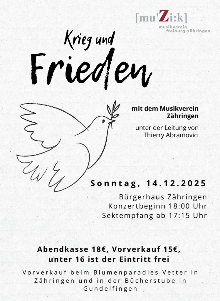 Am 3. Advent , dem 14. Dezember 2025 lädt der Musikverein Zähringen zu seinem besonderen Winterkonzert „Krieg und Frieden“ ins Bürgerhaus Zähringen ein. Das Orchester nimmt das Publikum mit auf eine eindrucksvolle musikalische Reise zwischen Spannung und Hoffnung – ein Programm, das berührt und zum Nachdenken anregt. Unter der Leitung von Thierry Abramovici erwartet die Zuhörer ein Abend voller Klangkraft, Emotion und stimmungsvoller Momente. Wir freuen uns auf zahlreiche Gäste, die diesen musikalischen Jahresabschluss mit uns erleben möchten.